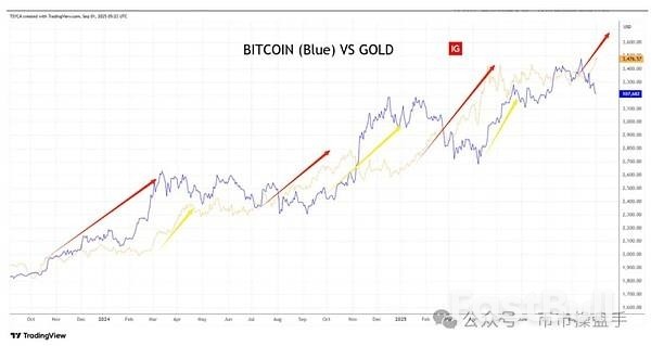 根据TradingView数据,自2024年10月以来,比特币与黄金整体走势趋同,但比特币每一轮的上涨行情均较黄金滞后3–5周。这也解释了为何本轮黄金率先创出历史新高,而比特币并未立即跟进。只要市场对美联储货币宽松和美元贬值的预期保持不变,比特币后续补涨仍将是大概率事件。