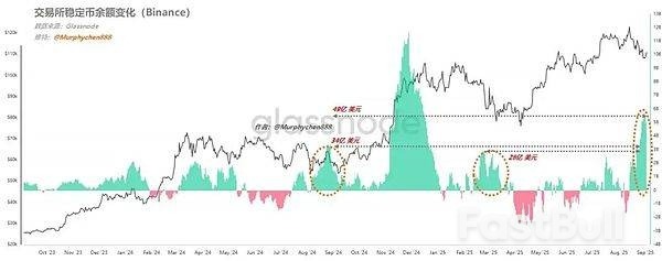 数据显示,从8月13日BTC进入回调以来,Binance的主流稳定币余额(USDT+USDC)出现了惊人的大幅增长。在8月13日到9月3日这段时间里,净增长高达49亿美元!