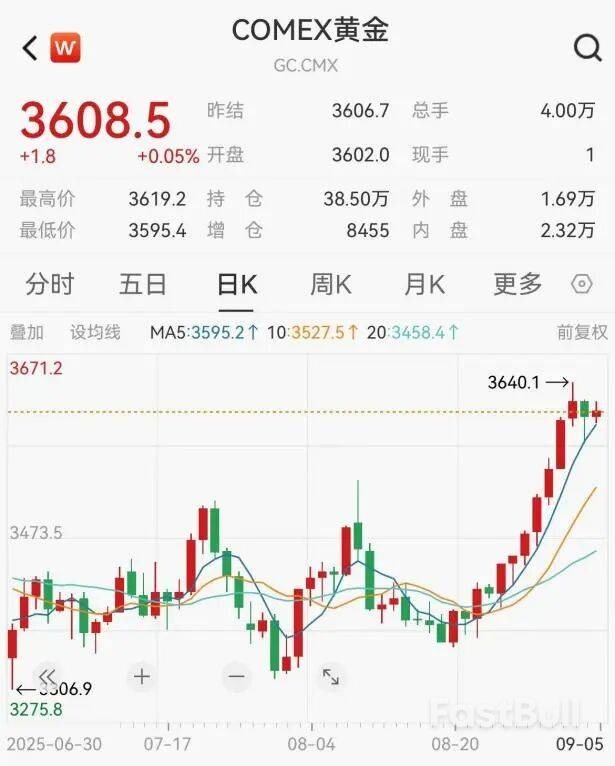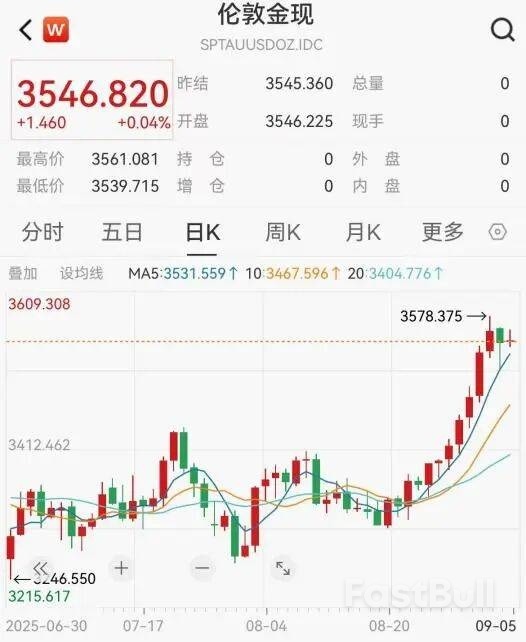 9月5日,国际金价延续涨势。截至发稿,伦敦黄金现货价格上涨0.04%,报3546.82美元/盎司;COMEX黄金期货价格涨0.05%,突破3600美元/盎司。