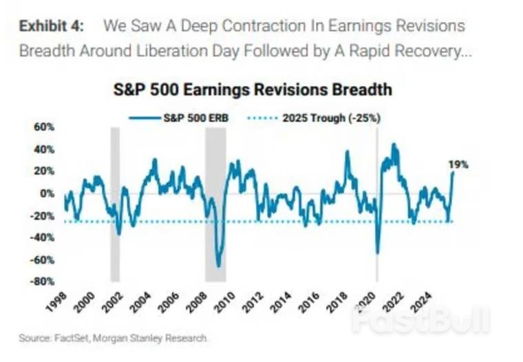 在解放日附近,盈利修正广度出现大幅收缩,随后又迅速恢复威尔逊表示,对于最新就业数据感到不安的投资者应记住:“就业数据始终是‘后知后觉’的指标;等到它们确认经济陷入低迷时,股市往往早已察觉。”