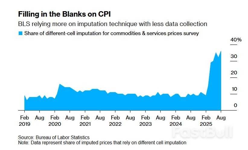 美国劳工统计局(BLS)周四披露,8月消费者价格指数(CPI)中依赖“不同单元估算”(different-cell imputation)生成的价格占比飙升至36%,较7月的32%进一步攀升,创2019年有记录以来最高水平。这一比例在2022年2月仅为9%,三年间激增近300%,凸显数据收集体系的严重恶化。