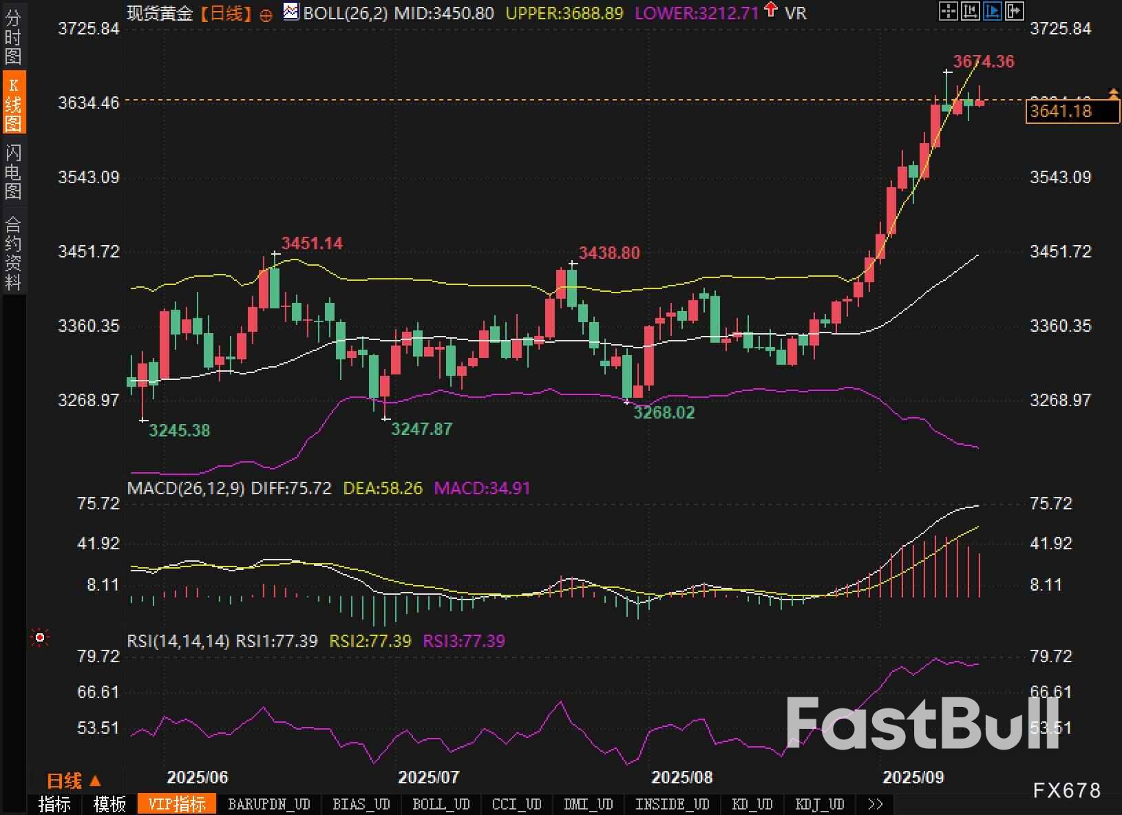 周五(9月12日),现货黄金延续上涨态势,盘中最高触及3656美元/盎司,欧洲时段略有回调至3641.18美元附近。本轮上涨行情自8月中旬启动以来,累计涨幅已超过200美元,展现出强劲的多头动能。