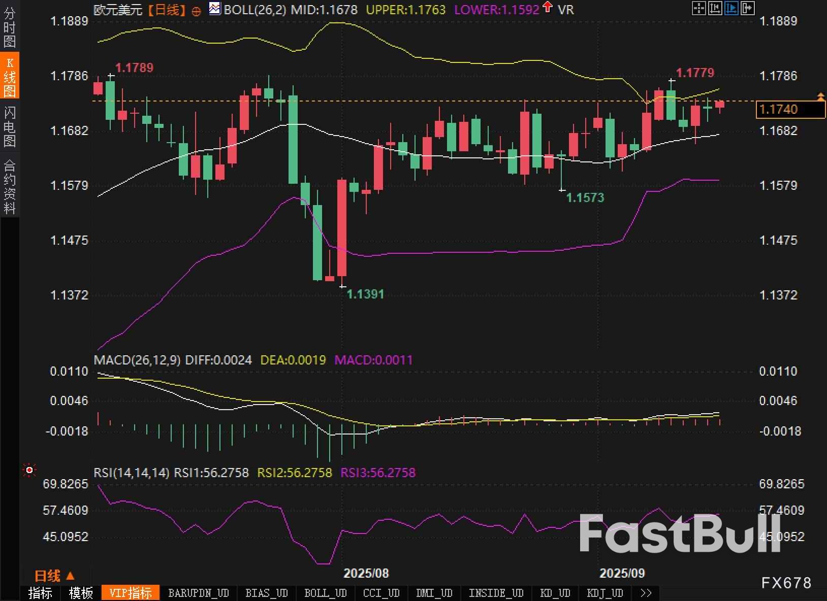 综合判断:上方阻力依次关注1.1763(布林上轨)—1.1779—1.1789;若有效上破并放量,日线或转入“上轨外沿走强”的趋势延伸段;反之,若在上轨附近反复受阻并伴随长上影,需提防假突破与回落测试中轨1.1678;支撑看1.1700整数关口与1.1680附近价区,再下为1.1592(布林下轨)。在缺乏放量与强动能配合前,形态仍以箱体上沿反复博弈为主,事件风险可能成为方向选择的“触发器”。