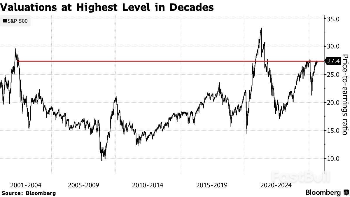 目前,标普500指数的预期市盈率超过27倍,这一水平仅在极度看涨的行情中才会出现。科技股的估值同样高企,例如,甲骨文(ORCL.US)和博通(AVGO.US)的市盈率分别高达67倍和86倍,确实令人担忧。