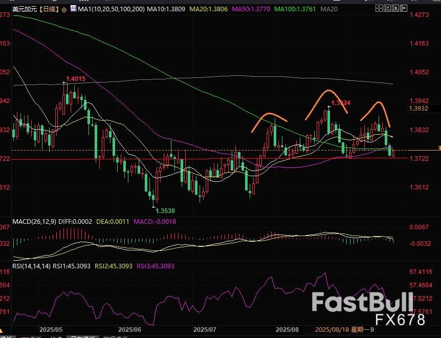 美元兑加元当前处于中性震荡区间,8月以来始终在1.39阻力位下方整理。市场疑似正在构建头肩顶形态,但需价格明确跌破1.3720确认形态成立——一旦破位,将打开下行空间,目标指向2025年低点1.3650及1.3540区间