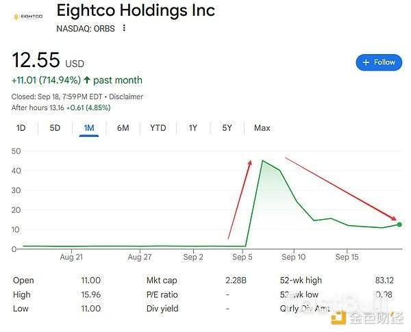 一个鲜明的例子是,此前提及的Eightco包装公司,曾宣布将购买与OpenAI首席执行官Sam Altman相关的世界币Worldcoin,其股价单日飙升3000%,但此后涨幅大幅度回落至714%。