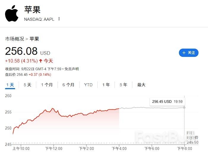 9月22日,苹果股价飙升4.3%,盘中最高触及256.64美元,为去年12月以来的最高水平,推动因素是新发布的iPhone 17系列机型需求超出预期,引发市场对升级周期重启的乐观情绪。