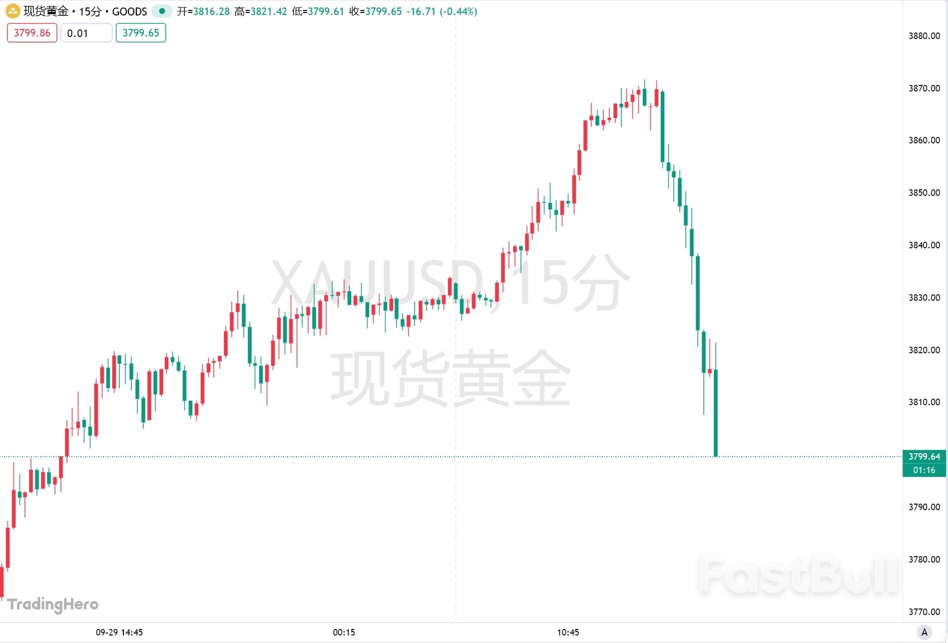 周二,由于投资者担心美国政府可能关门导致美元走弱,贵金属价格飙升。现货黄金一度将历史新高刷新至3870美元左右,随后因投资者获利了结持续下挫,回落至3800美元/盎司下方,较日高低70美元以上,日内跌近1%。
