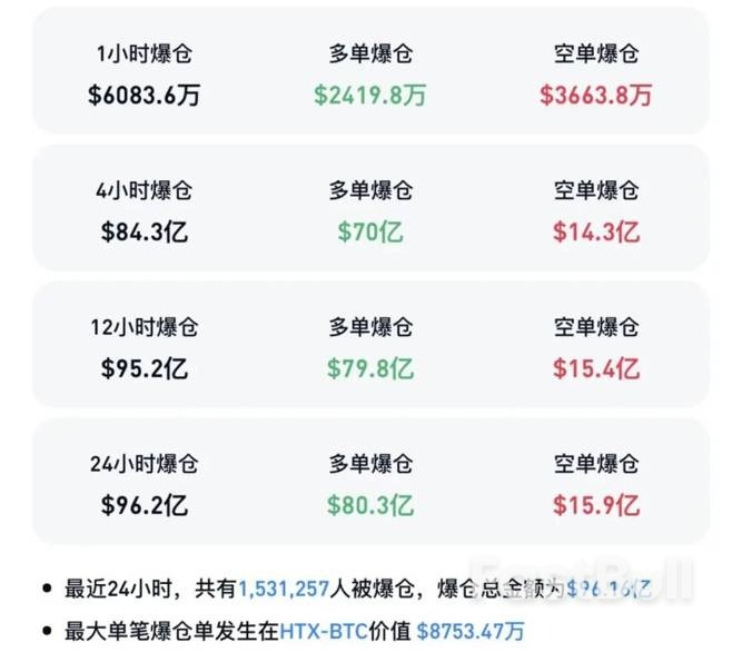 Coinglass数据显示,过去24小时加密货币市场共有超153万人被爆仓,爆仓总金额为96.16亿美元,其中多单爆仓80.3亿美元,空单爆仓15.9亿美元。
