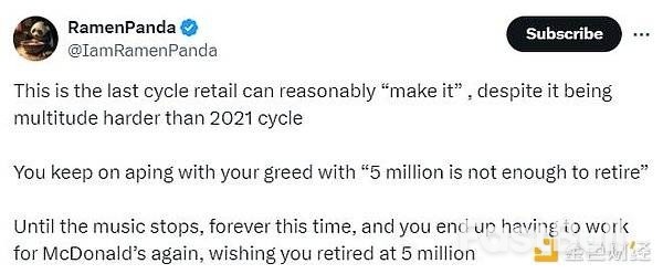 本轮周期中多数CT用户并未获得实质收益开始陷入"孤注一掷"的焦虑状态。叠加当前负面情绪与周期晚期特征(若你相信四年周期理论),事实上我们已超过18个月的历史见顶节点。