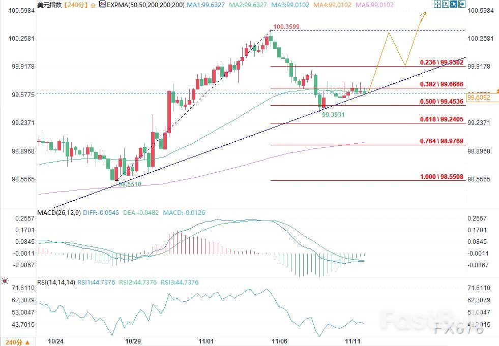 美元指数(DXY)从99.25支撑区间反弹后,在99.67附近盘整,维持短期看涨倾向。4小时图显示,价格走势遵循上升趋势线,多头捍卫更高低点。