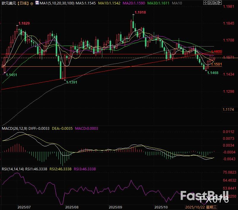 周二(11月11日)欧元兑美元近期延续反弹态势,在1.1500区间中值附近持续横盘整理后逐步攀升,成功收复前期失地,目前交投于1.1572附近涨0.14%。