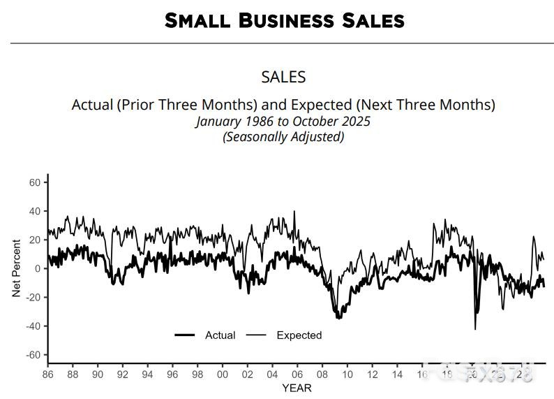 下图可以看出中小企业乐观预期受到提振后实际销售水平与预期背道而驰。
