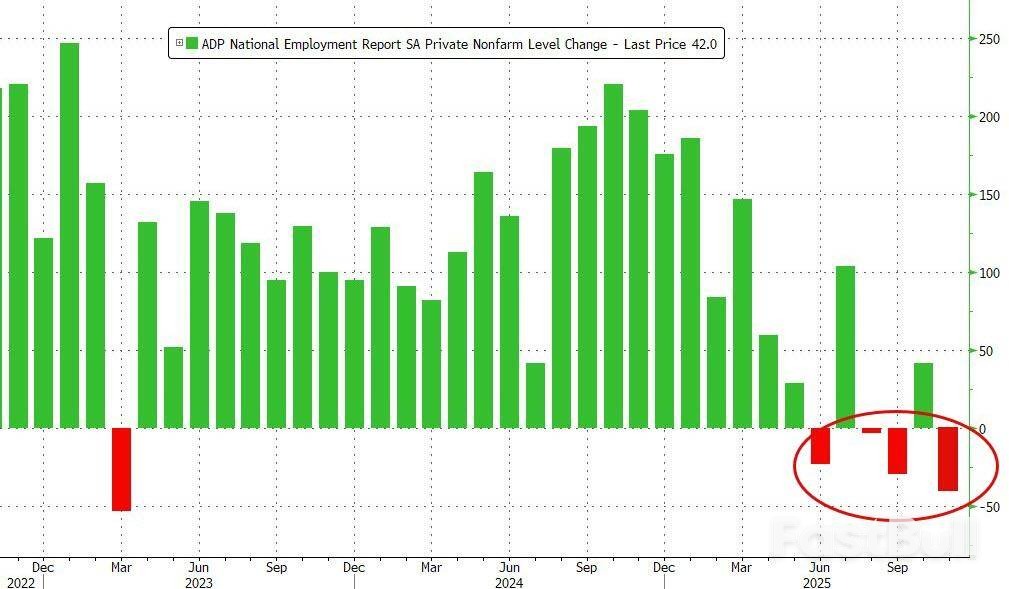 多家知名企业近期宣布的大规模裁员计划引发市场对劳动力市场加速恶化的担忧,而今日最新发布的"小非农"ADP周度就业报告印证了这一恐惧。