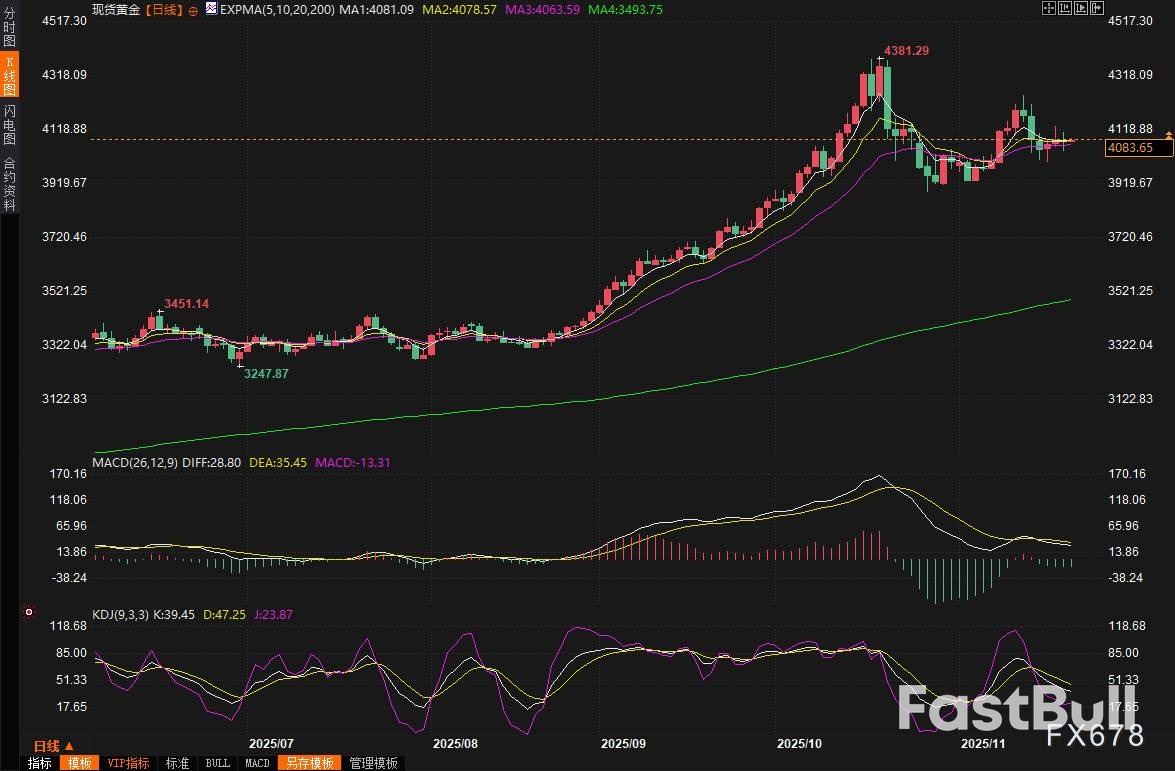 周四(11月20日)现货黄金在剧烈震荡中顽强收稳,收报4077.17美元/盎司,全天最高冲至4110.03美元,最低跌至4038.82美元,波动幅度超过70美元。这波看似平静的横盘,实则暗流涌动——美国迟来的9月非农就业报告彻底打乱了市场节奏,既浇灭了部分降息幻想,又因为失业率意外抬升而重新点燃了鸽派希望。黄金作为最敏感的利率交易品种,再一次站在了风口浪尖。周五(11月21日)亚市早盘,现货黄金窄幅震荡,目前交投于4085美元/盎司附近,市场目光开始聚焦美国提出的俄乌和平计划。