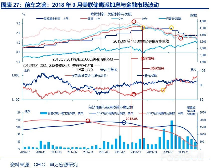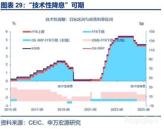 当下,美国金融市场较为脆弱,避免制造恐慌或是鲍威尔的一个重要考虑。回顾2018年9月FOMC例会,美联储鹰派加息——声明中删除了"货币政策立场依然宽松",但鲍威尔在发布会中解释:"这并不是意味着将改变政策路径。相反,这表明政策正朝着我们预期的方向推进。"9月的点阵图指引还将降息4次。本次例会导致美股大幅回调超10个百分点,直接导致后续货币政策立场转鸽。事后看,9月就是复苏周期的顶点。此后美联储的政策路径是:11月暂停加息、12月例会最后一次加息且表态偏鸽、2019年初基本确认不加息。所以,有了前车之鉴,鲍威尔可能跟随"市场先生"。"技术性降息"或是一个折中的办法,即不改变联邦基金利率目标期间,但下移准备金利率5-10bps,以缓解流动性压力。