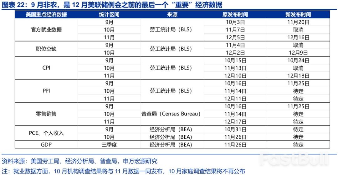 2)数据可得性层面,美国10月就业、CPI数据已取消发布,11月就业、CPI数据公布日期均被推迟至12月例会之后,使得9月非农成为美联储在12月会议前能够获取的最后一份"关键"经济数据,可能促使美联储"谨慎"行事;