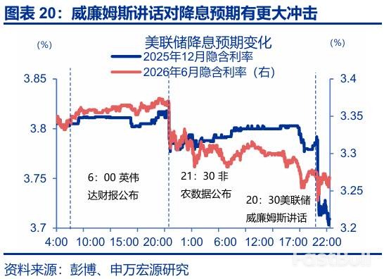 9月非农因其表现"好坏参半"及公布"滞后",对降息预期的影响远弱于威廉姆斯讲话。11月20日非农数据公布后,12月降息概率仅小幅上行9%;11月21日,纽约联储主席威廉姆斯发表偏鸽言论,称近期仍有进一步降息空间,市场对12月降息的预期概率迅速攀升至近70%。