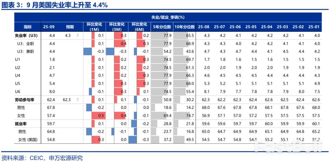 非农数据质量、劳动力供给改善对"非农强劲、失业恶化"的解释力不强。1)9月机构调查的首次回复率高达80.2%,显著高于历史均值,数据可信度较高;2)9月失业率上升0.12个百分点,主要推动力来自于"失业或离职"人群,而"新进入劳动力市场"群体贡献基本不变。