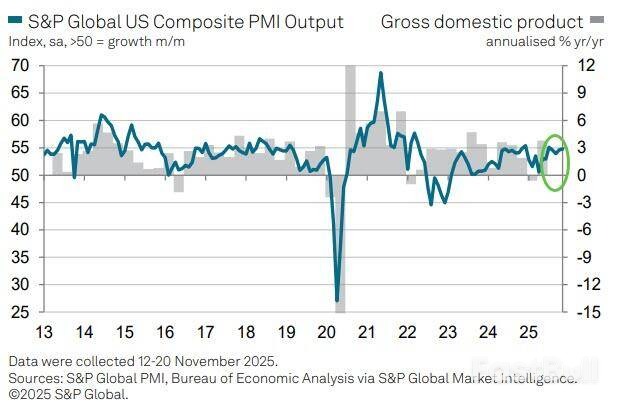 11月的PMI初值显示,美国经济依然相对强劲,迹象表明第四季度迄今的年化GDP增长约为2.5%。目前来看,经济回升在制造业和庞大的服务业两大领域均有体现,走势令人鼓舞。