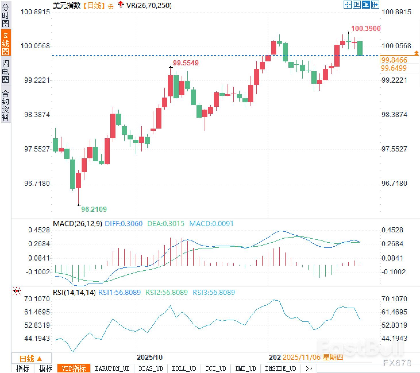 周二(11月25日)美元指数走出连续破底的下行走势,配合消息跌破了上升趋势线,目前交投于99.96附近,据美国官员称,乌克兰同意和平协议条款,和平协议的一些次要细节仍未敲定,这份19点的乌克兰和平计划中已不再包含赦免条款,市场避险情绪缓解,美元指数承压。