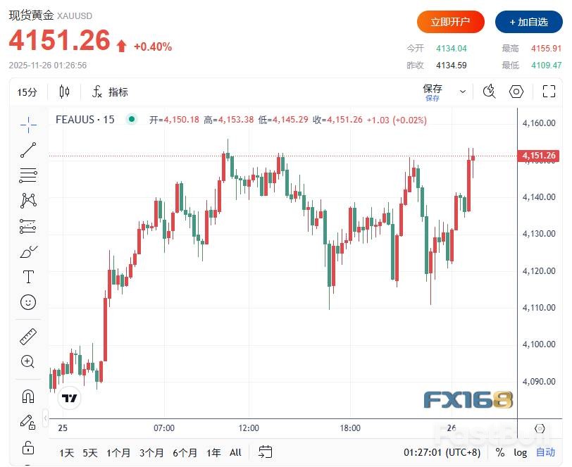 美市盘中,现货黄金保持高位盘整,现交投日高4155.91美元/盎司下方不远处,日内上涨0.4%。