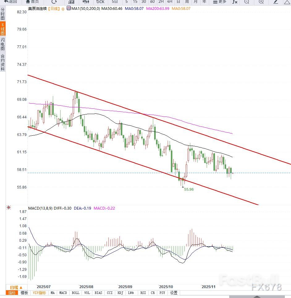 从技术面来看,美原油(WTI)日线图呈现弱势整理格局。价格近期持续运行于50日与200日均线下方,形成"死亡交叉"后的延续性下跌走势,表明中期趋势偏空。