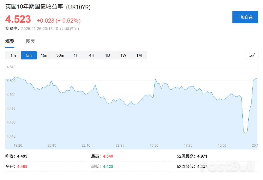 与汇市波动相呼应,英国国债市场同样出现显著调整。10年期英债收益率在OBR报告泄露后从4.43%快速攀升至4.55%,涨幅超过10个基点。收益率的上行反映出市场对英国政府大规模增税及支出计划可能推高通胀的担忧,同时也暗示交易员正在削减对英国央行年内降息幅度的押注。