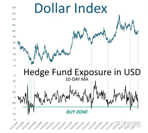 分析师吉列尔梅·塔瓦雷斯重点解读了这一格局,并警示交易拥挤度已达危险水平。他在报告中写道:"对冲基金持有大量美元指数空头头寸(即多头头寸狂减),从历史数据来看,类似头寸水平往往孕育着稳健的买入机会——至少是短期反弹机会。当一项交易拥挤度达到极致时,反向操作通常具备交易价值。"