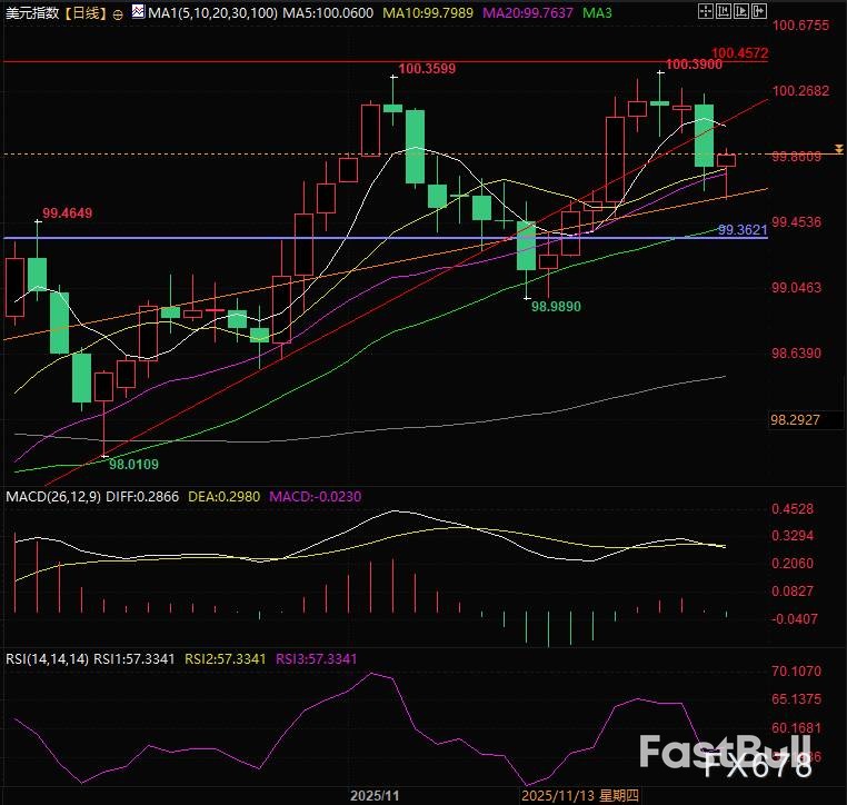 周三(11月26日)亚欧交易时段,美元指数走出多次探底回升的宽幅震荡走势,目前交投于99.79附近,受数据影响交易员对美国12月降息预期的持续升温推动美元早盘继续探底,同时俄乌和平协议签署协议延后的消息以及空头头寸增仓过猛后多头的回补又提振了美元指数,最后在英国超预期财政预案和美国数据影响下继续宽幅震荡。