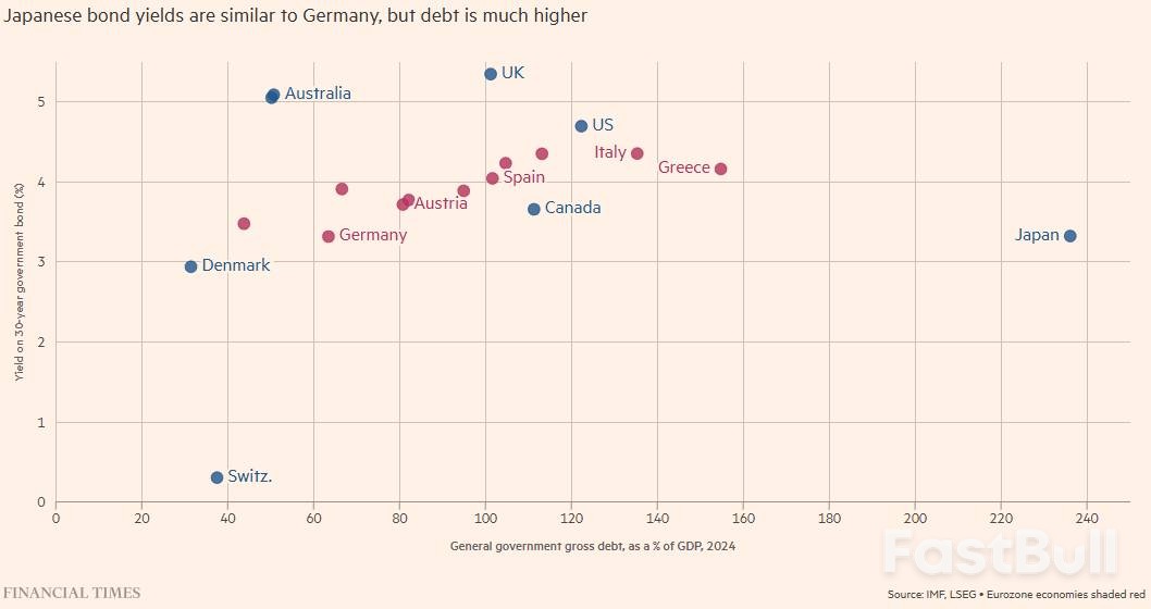最直观的佐证是对比主要发达经济体的政府总债务与30年期国债收益率:日本收益率竟与德国持平,尽管德国负债率远低于日本。由于日本央行仍是债券的重要买家,日本收益率仍远未接近市场真实水平。