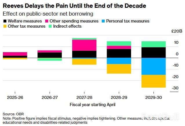 标普则对将主要紧缩措施推迟至五年财政计划的后期表示类似担忧,警告财政大臣可能被迫调整方针。标普表示:"英国下届大选将于2029年举行,恰逢重大税收措施在2028年生效后不久。因此现政府有可能随着投票日临近而选择撤回部分已公布的紧缩政策。"