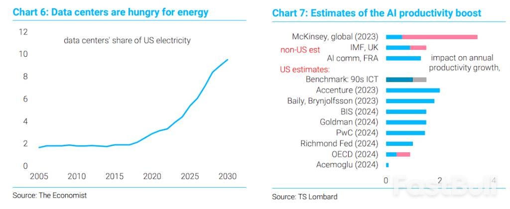 美国数据中心用电占比从2005年的约2%预计将在2030年升至12%。但总体而言,AI资本支出对均衡利率的推升作用有限,只是美国经济能够承受比2010年代更高利率的又一个理由。
