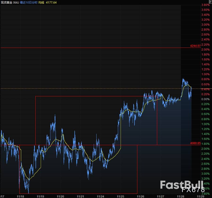 市场对美联储12月再度降息0.25%的预期已愈发强烈,据芝商所(CMEGroup)数据,该情景落地概率已攀升至84.7%,与美联储年底前偏宽松的政策立场形成共振。关键变量在于,白宫经济顾问凯文?哈塞特成为下任美联储主席热门人选,市场普遍预期其将落实特朗普的降息诉求,这一预期持续为黄金注入支撑动能,抵消了美元温和走强的压制。在降息预期主导下,10年期美国国债收益率已从4.2%附近跌破4.0%关键支撑位,作为黄金的核心对标资产,国债收益率下行直接削弱了其配置吸引力,叠加美元指数走弱,腾出来的流动性转向黄金避险,为金价近期反弹提供了实质性买盘。