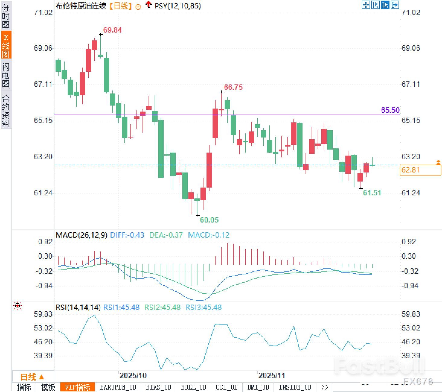 技术方面从当前布伦特原油的技术图形来看,价格在62.80美元附近波动。整体趋势在最近一段时间出现了震荡调整。首先,从日线图中可以看到,布油价格曾一度触及69.84美元的高点,但随后逐渐回落至60美元附近,并在61.51美元的支撑位附近稳定反弹。当前价格接近65.50美元的压力位,短期内可能会面临一定的卖压。