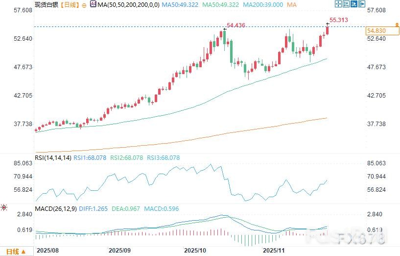 周五(11月28日)早盘,现货白银价格盘中攀升至55.313美元/盎司,突破历史新高。