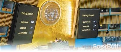 9月12日,联合国大会通过决议,支持关于和平解决巴勒斯坦问题及实施"两国方案"的纽约宣言。图为会场显示屏显示投票结果。 |