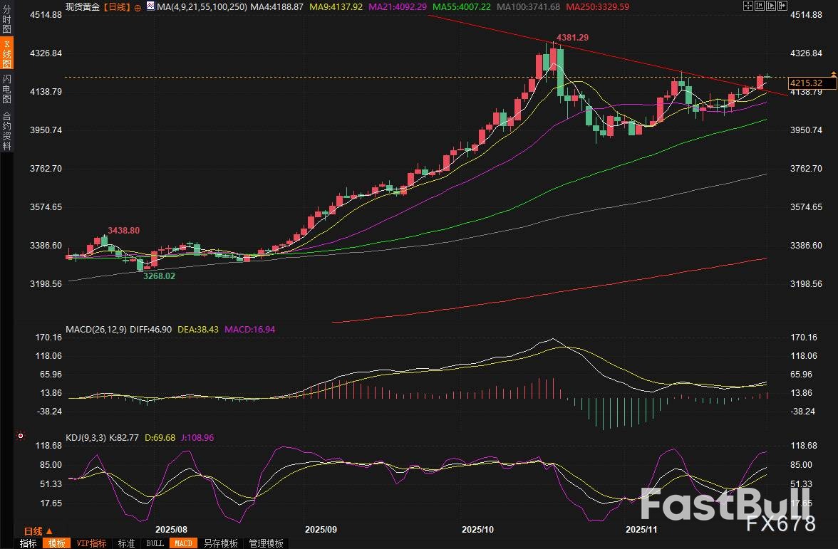 现货黄金在上周五(11月28日)强劲冲高,涨幅达到1.5%,触及两周新高4226.56美元/盎司,最终收报4219.20美元/盎司。从月线来看,金价11月上涨5.4%,这已经是连续第四个月的上涨,显示出市场对黄金的持续青睐。周一(12月1日)亚洲时段,现货黄金继续保持涨势,一度刷新高点至4230.41美元/盎司。这种连续上涨的格局并非偶然,而是受到了宏观经济环境和货币政策预期的双重支撑。投资者们将黄金视为对抗不确定性的盾牌,尤其是在经济增速放缓的预期下,黄金的不孳息特性变得格外吸引人。