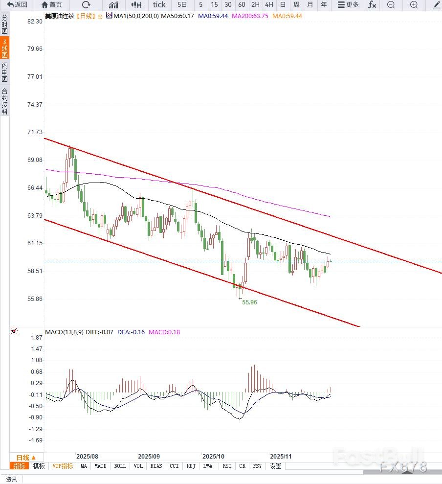 MACD指标出现低位金叉并向零轴上方靠拢,动能柱逐步放大,代表趋势偏向进一步强化。下方支撑关注58.50美元与57.80美元区域,一旦守稳,多头有机会向60.50美元及61.30美元一线试探