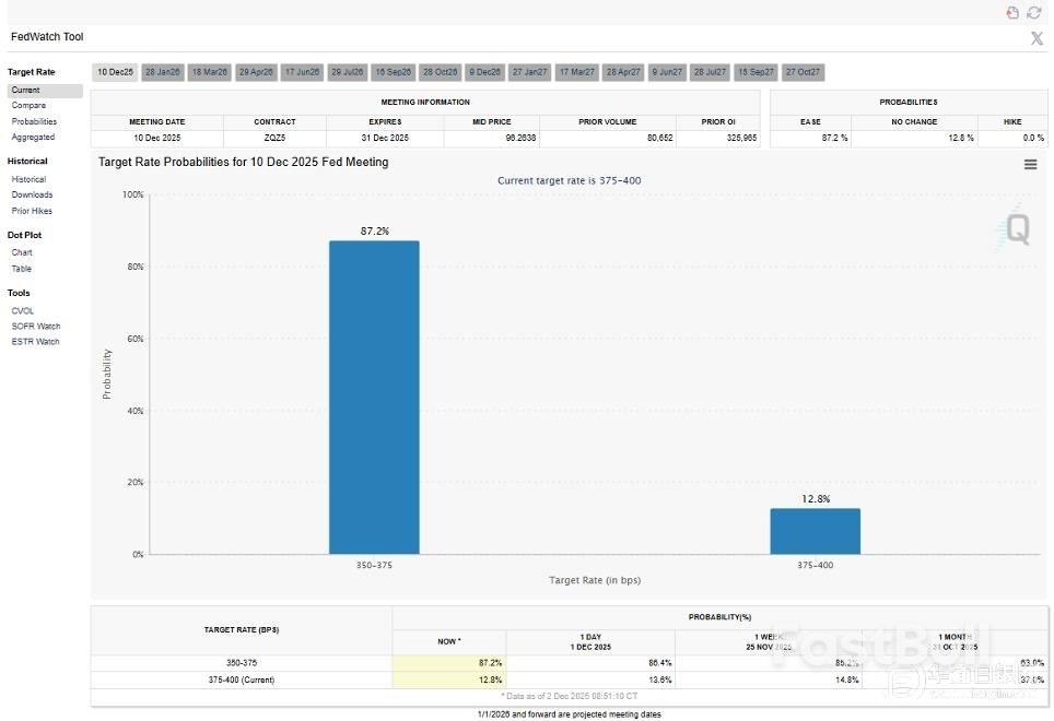根据芝加哥商品交易所的美联储观察工具,市场目前认为美联储在12月降息的可能性很高,有87%的可能性。