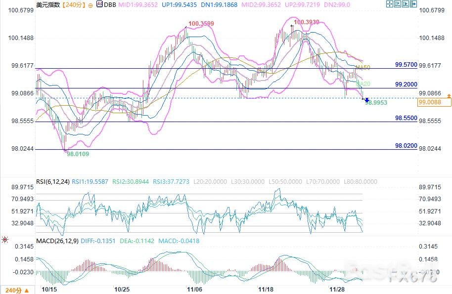 最后关注关键价位:短期支撑集中在当前双下轨附近的98.9989,若跌破则下看前期低点98.5510;阻力方面,第一压力位是双布林带中轨对应的99.2附近(与MA20重叠),其次是前期反弹高点对应的99.5一线,价格反弹至99.2区域时,易受双轨+均线的重叠压制回落。