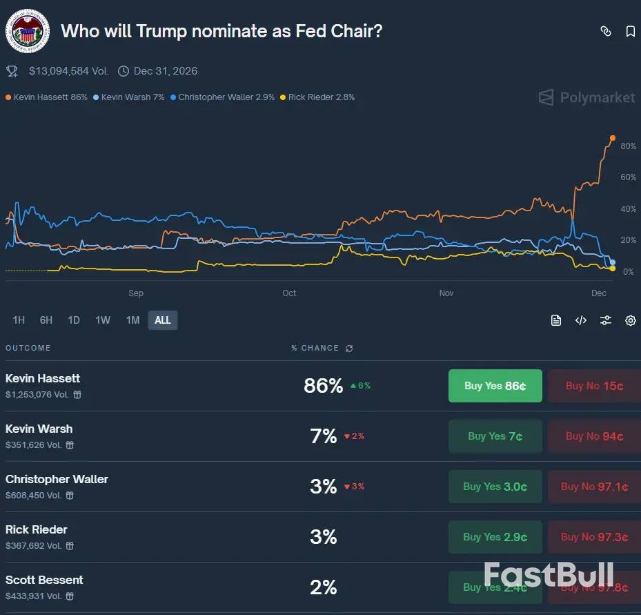 在预测市场Polymarket上,哈塞特当选新一任美联储主席的概率已经上升至了86%,远远领先其他可能的美联储新任主席人选。