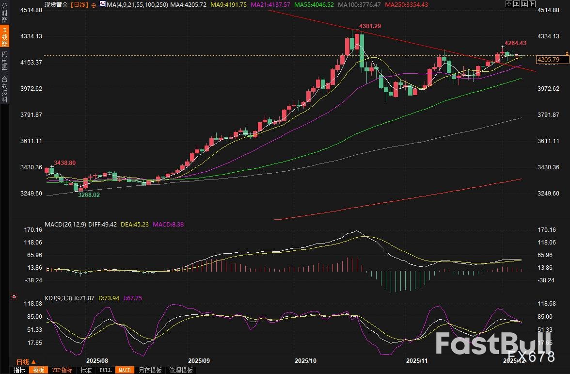 现货黄金在周四(12月4日)震荡微涨0.13%,这一天的盘中波动虽不算剧烈,却充分体现了市场的谨慎心态:金价一度下探至4175美元附近,显示出短期抛售压力的存在,但随后反弹至4219美元高点,表明买盘力量依然活跃,最终收报4208.60美元/盎司。随着美国PCE数据公布在即,市场观望情绪日益浓厚,交投空间明显缩小。一方面,美国10年期国债收益率的上涨对金价形成了压制,因为更高的收益率往往吸引资金流向债券市场,削弱黄金的吸引力;另一方面,美元指数虽在触及一个月低点后小幅反弹,但整体疲软走势为黄金提供了缓冲空间。周五(12月5日)亚市早盘,现货黄金窄幅震荡,目前交投于4205美元/盎司附近。