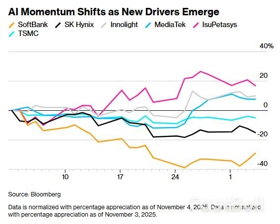 日本软银集团因与OpenAI关系密切,而被视为市场上对后者直接的映射股票——其股价在11月暴跌38%,创下25年来最差月度表现。英伟达核心的代工厂台积电与内存供应商SK海力士上月股价也均下跌4%,此前的大涨势头已有所消退。