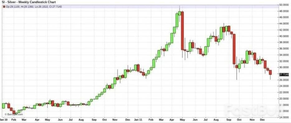 2010年末开始的牛市中,白银用八个月时间涨至48美元,随后几个月便回落至26美元。