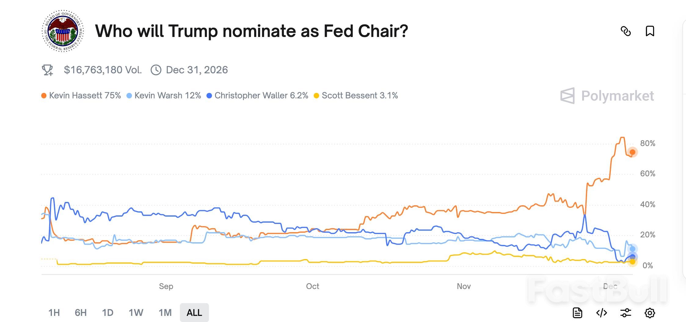 截至12月5日,在Polymarket等预测市场平台上,哈塞特当选的概率约为75%;彭博等主流媒体此前也援引消息人士称,哈塞特已经成为接替鲍威尔的"头号热门"。而特朗普本人则在公开场合表示已经做出决定,将在2026年初正式宣布人选,并多次在采访中点名称赞哈塞特。