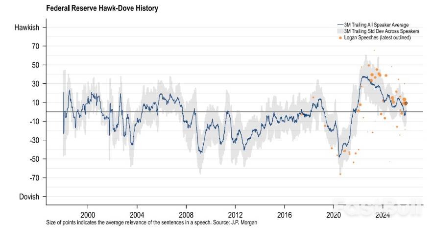 尽管新任美联储主席几乎肯定会将FOMC的立场导向鸽派方向,但也将面临一股对立力量。克利夫兰联储主席哈玛克和达拉斯联储主席洛根(两人可以说是19位FOMC成员中最为鹰派的)都将在2026年成为投票委员。