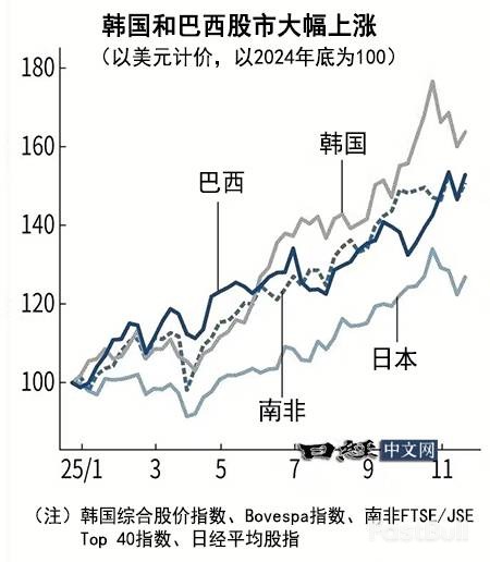 在股价上涨与货币升值的双重推动下,部分国家以美元计价的股市回报尤为突出。例如,巴西的Bovespa指数和南非的FTSE/JSE Top 40指数在2025年均上涨了五成。而韩国综合股价指数虽然韩元兑美元汇率保持稳定,但以韩元计价的指数大幅上涨,换算成美元计价后,涨幅高达六成。