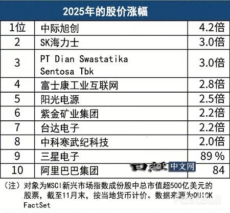 拉动此轮新兴市场上涨行情的火车头是科技股。在MSCI新兴市场指数的成分股中,总市值超过500亿美元的企业股价涨幅榜上,亚洲高科技公司的身影接连不断。