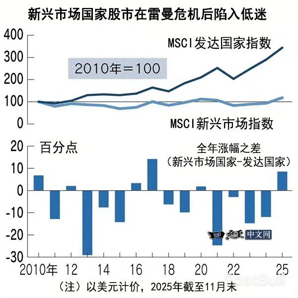 衡量新兴市场股票表现的权威指标——MSCI新兴市场指数,清晰地揭示了这一趋势。截至2025年11月底,该指数以美元计价的年度涨幅已达27%,以当地货币计价的涨幅也达到25%。